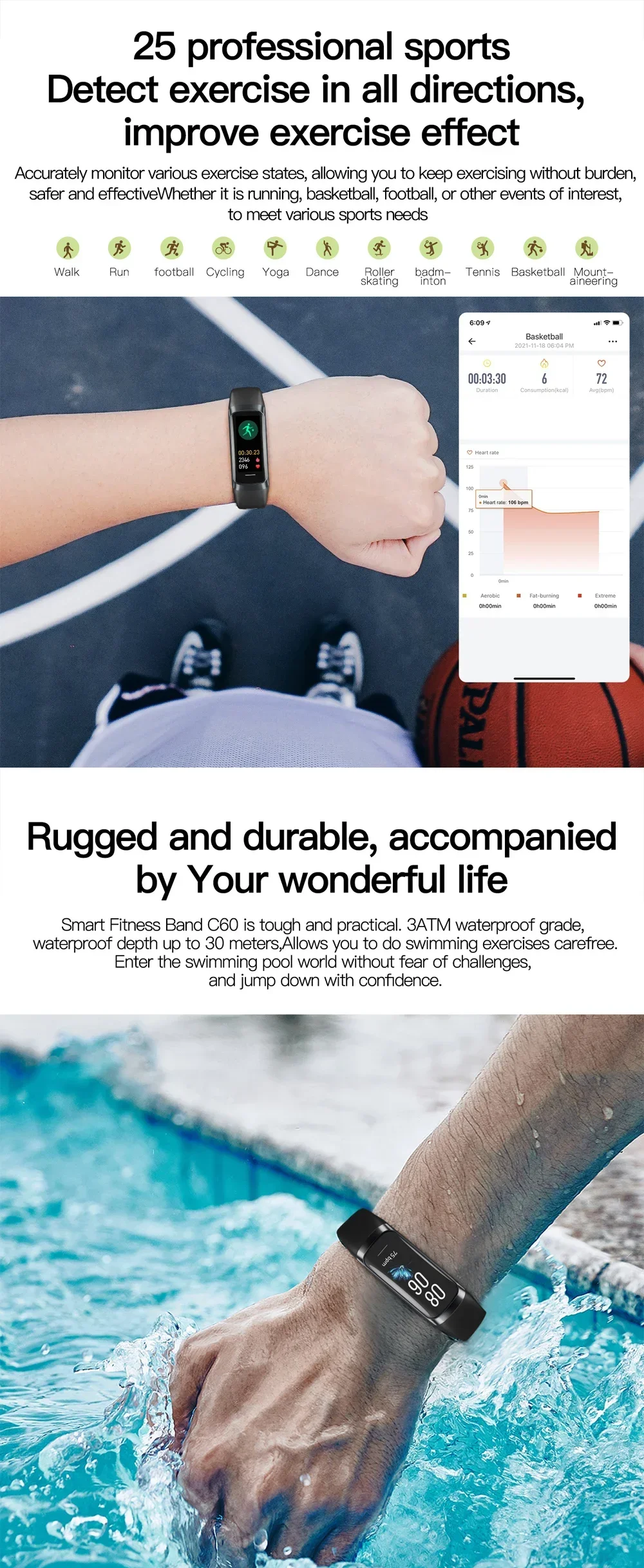 Pedometer, Calls Reminder, Social APP reminder, Messages Reminder, Sedentary reminder, Blood pressure, Blood Oxygen, Sleep monitor, Sport Mode, Alarm clock, Remote Control Camera, Weather display etc.